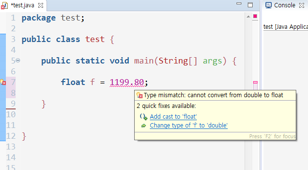 이것을 해결하려면 아래와 같이 리터럴 끝에 소문자나 대문자 F 를 붙여주면된다.