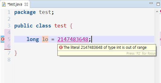 마우스를 올려보면 The literal 2147483648 of type int is out of range 라는 에러 메시지박스가 뜬다.