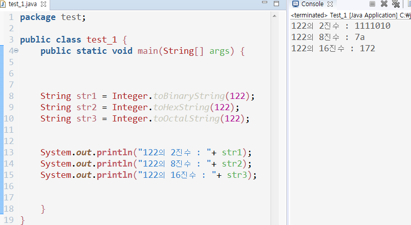 10진수 122를 각각 2진수,8진수,16진수로 변환하는 메서드를 호출하여