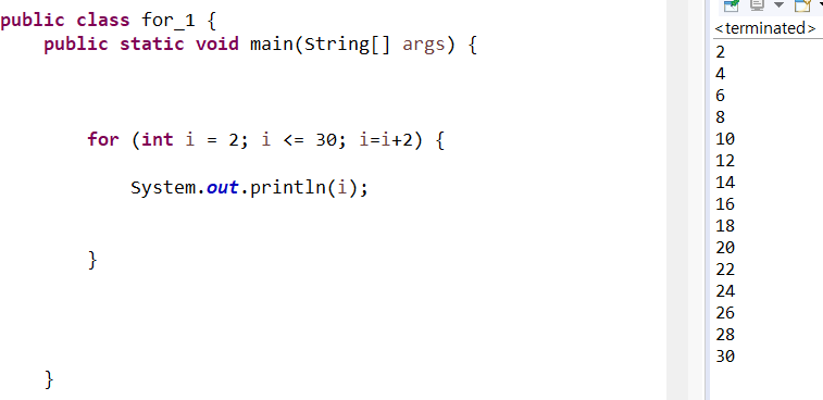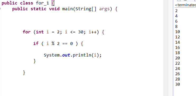 결국은 2 출력, 4 출력, 6 출력 .... 30 출력 까지 수행한다.