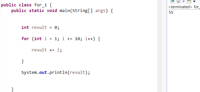 1부터 10까지 더한 값을 담을 result 변수를 먼저 선언한 후 0으로 초기화했다.