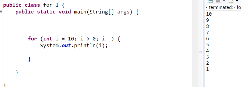 i는 10부터 시작하여 1씩 감소하며 출력되고, i>0 의 조건을 만족하지 못하는 순간 반복문을 탈출한다.