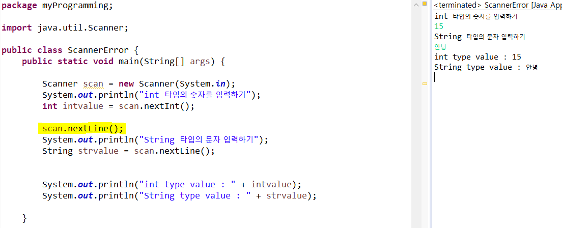 남겨진 개행문자가 다음 scan.nextLine() 의 입력으로 처리되어
